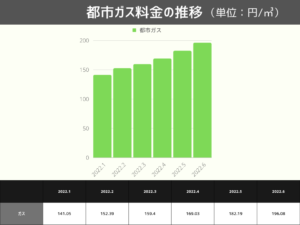 電気料金に加えて都市ガス料金も値上げが続いていますが、所信表明では都市ガス料金に関することは触れられていませんでした。都市ガス料金の値上がりの推移については、下のグラフをご覧ください。