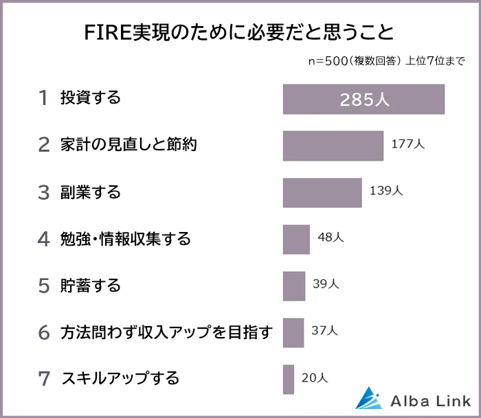 最後に、FIRE実現のために必要だと思うことを聞いたところ、最も多かった回答は「投資する(285人)」でした。2位「家計の見直しと節約(177人)」、3位「副業する(139人)」と続きます。