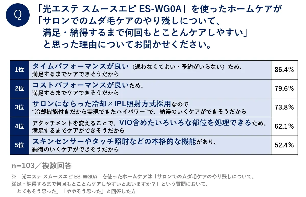 また、「サロンにならった冷却×IPL照射方式採用なので“冷却機能付きだから実現できたハイパワー”で、納得のいくケアができそうだから」(73.8%)、「アタッチメントを変えることで、VIO含めたいろいろな部位を処理できるため、満足するまでケアができそうだから」(62.1%)、「スキンセンサーやタッチ照射などの本格的な機能があり、納得のいくケアができそうだから」(52.4%)などの機能性を評価する声も目立っています。