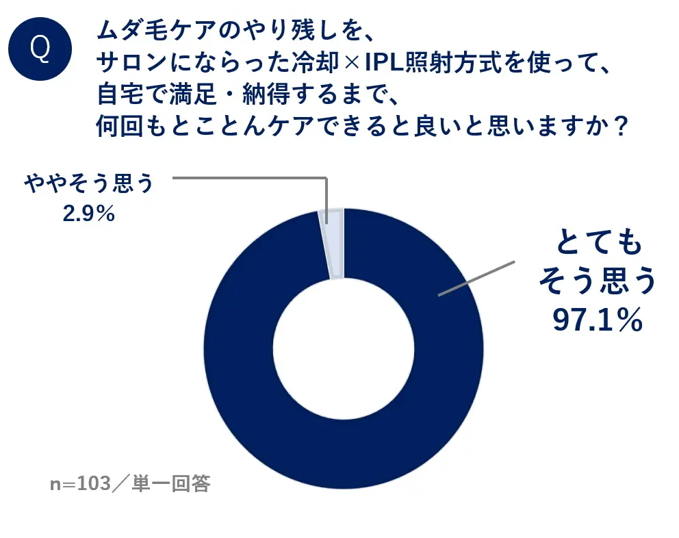 そこで、「ムダ毛ケアのやり残しを、サロンにならった冷却×IPL照射方式を使って、自宅で満足・納得するまで、何回もとことんケアできると良いと思いますか?」と聞くと、実に97.1%が「とてもそう思う」、2.9%が「ややそう思う」と回答。また、調査回答者(103名)全員が、ムダ毛ケアの「やり残し」を自宅で満足・納得するまで何回もとことんケアできれば、「コスト(費用)が節約できると思う」「時間が節約できると思う」と答えています。
