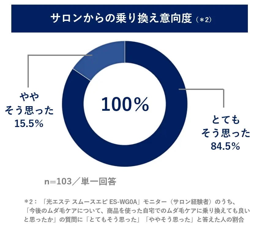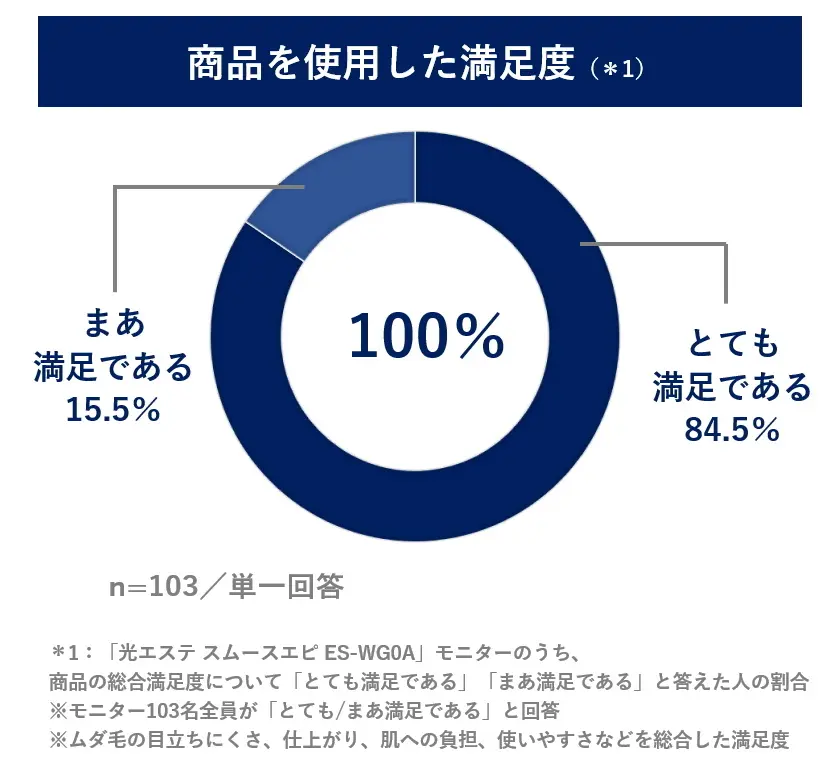 その結果、「商品を使用した満足度」は100%(モニター103人中、103人全員が「とても満足である」「まあ満足である」と回答)に。また、使用者の「サロンからの乗り換え意向度」(サロン経験者のうち、「今後のムダ毛ケアについて、商品を使った自宅でのムダ毛ケアに乗り換えても良いと思ったか」の質問に「とてもそう思った」「ややそう思った」と答えた人の割合)も100%(103名全員)にのぼりました。
