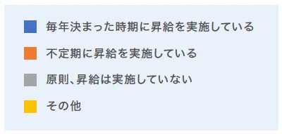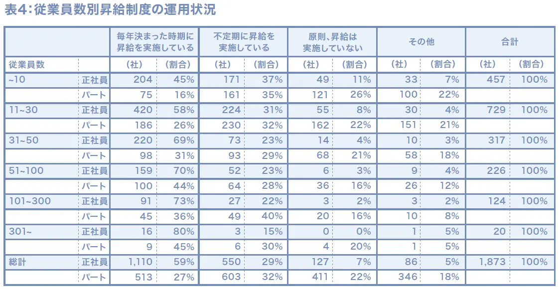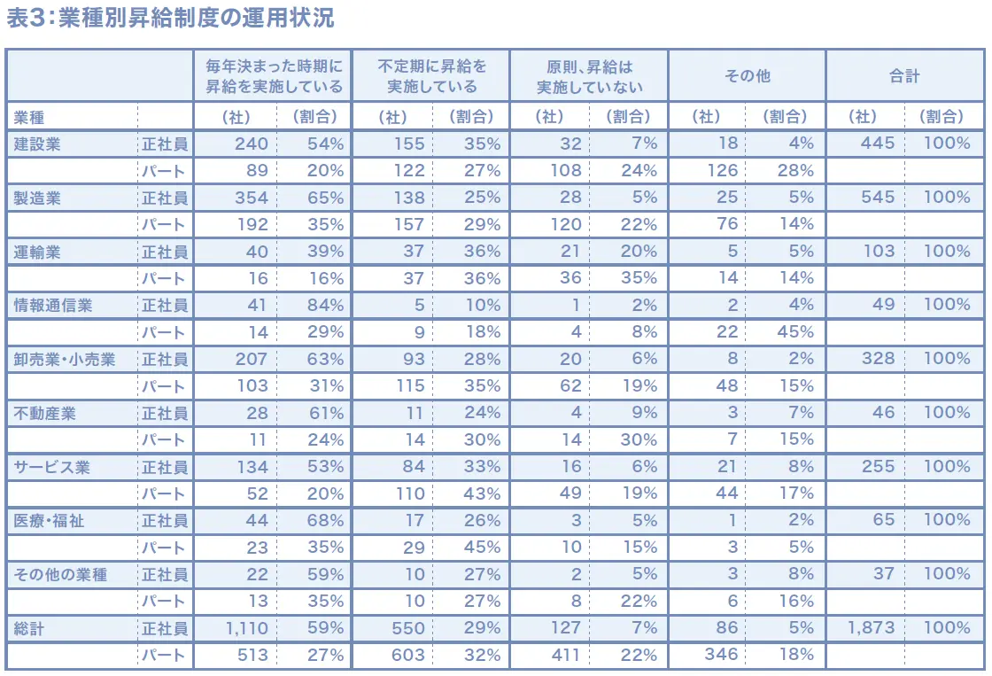 まず、正社員と非正規社員(パート・アルバイト等)のそれぞれに対する昇給制度を調査した。正社員において(図1)は、「毎年決まった時期に昇給を実施している」が1,110社(59%)、「不定期に実施している」が550社(29%)となり、「原則実施していない」が127社(7%)となった。業種別にみると、情報通信業は「毎年決まった時期に実施している」と回答した割合が他業種に比べて最も高く(83%)、「不定期に実施している・原則実施していない」は運輸業の割合が高かった(表3, 図3,4)。また、従業員数が多いほど、毎年決まった時期に昇給している企業が多いことが分かった(表4)。
