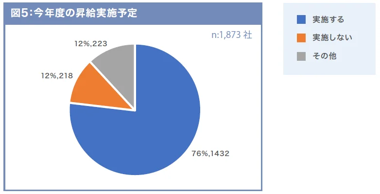 次に、今年度の昇給予定について尋ねたところ(図5)、「実施する」が1,432社(76%)、「実施しない」が118社(12%)であった。前設問で昇給は「不定期に実施する」としていた企業のうち、63%(351社)が今年度は昇給を「実施する」と回答しており、物価高騰の影響を考慮して多くの企業が賃上げを実施するとみられる。また、従業員数別にみると、31名以上の企業はそれぞれ80%以上が「実施する」と回答しているが、11~30名の企業は75%、~10名以下の企業は69%で、ここでも従業員数による違いがあることが分かった。