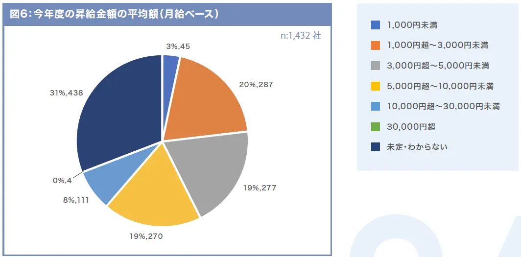 続いて、昇給を実施すると回答した企業(1, 432社)に対して、月給ベースでの平均昇給額を尋ねたところ(図6)、「1,000円超~3,000円未満(287社)」、「3,000円超~5,000円未満(277社)」、「5,000円超~10,000円未満(270社)」がほぼ並んでそれぞれ約20%ずつだった。昇給は実施するものの金額は「未定・わからない」と回答した企業が438社(31%)あったが、1,000円~10,000円での昇給を行う企業が多いのではないかと推測される。