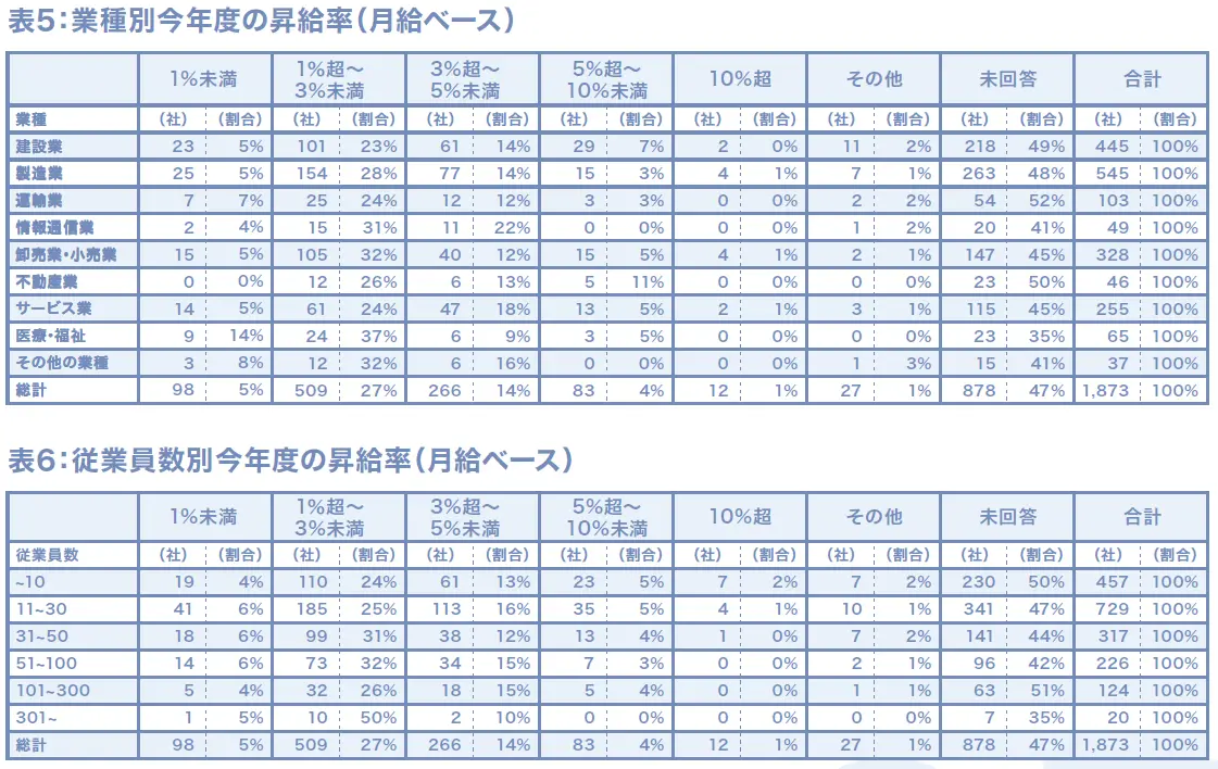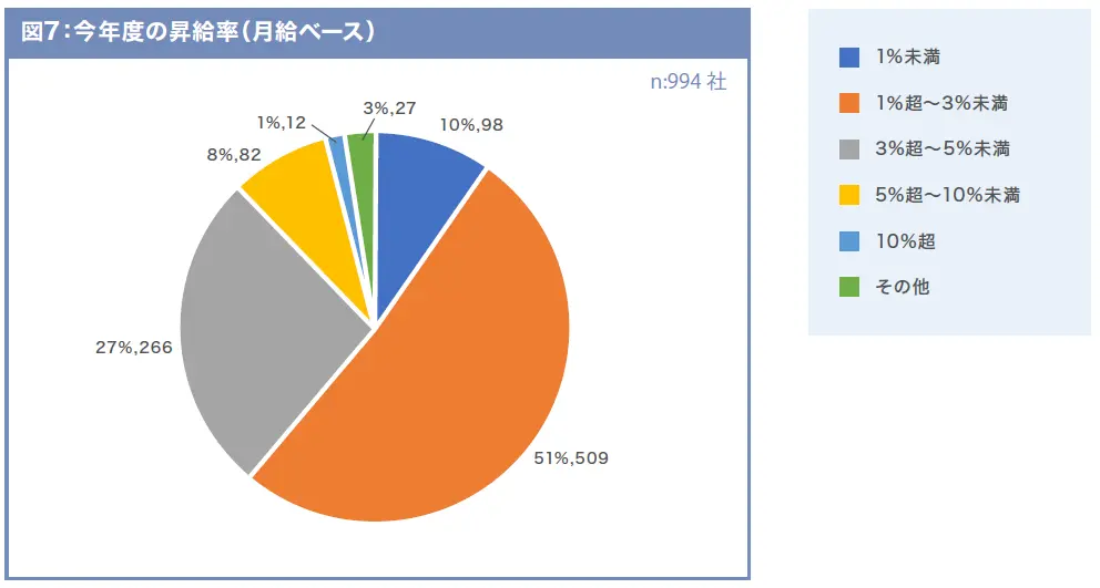 また、昇給金額が決まっている企業(994社)の昇給率は、最も多いのが「1%超~3%未満」が509社(51%)、次いで「3%超~5%未満」が266社(27%)、「1%未満」が98社(10%)と続いた(図7)。「2023春季生活闘争方針」(春闘)では5%程度の賃上げが要求されているが、それを下回る企業が大多数であることがわかる。