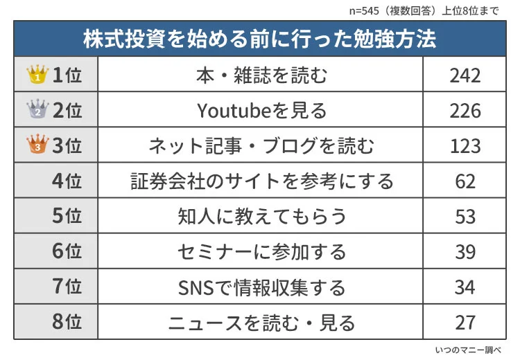 今回、ウェブスターマーケティング株式会社が運営するいつのマニー(https://webstar-marketing.co.jp/itsuno-money/ )は、株式投資の経験者545人を対象に「株式投資を始める前に行った勉強」についてアンケート調査を実施しました。