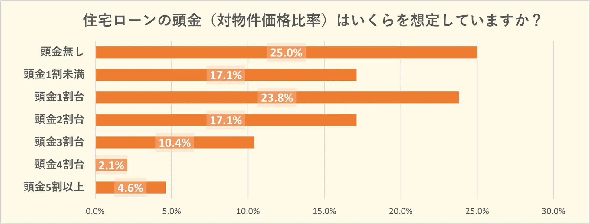 最多の得票は「頭金無し」の25.0%となりました。一方で、頭金の相場は住宅価格の2割以下と言われる中、2割以上の頭金を想定される方が合計34.2%もいることから、コロナ禍や金利変動の影響により頭金をより多く確保する方が多い可能性も考えられます。