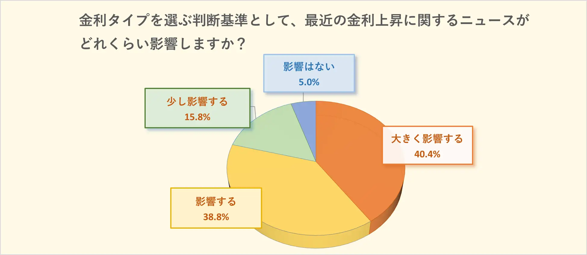 合計95%が「金利上昇のニュース」に少なからず影響を受けているという結果となりました。中でも、「大きく影響する」を選ぶ方が最も多くおよそ4割の得票となりました。