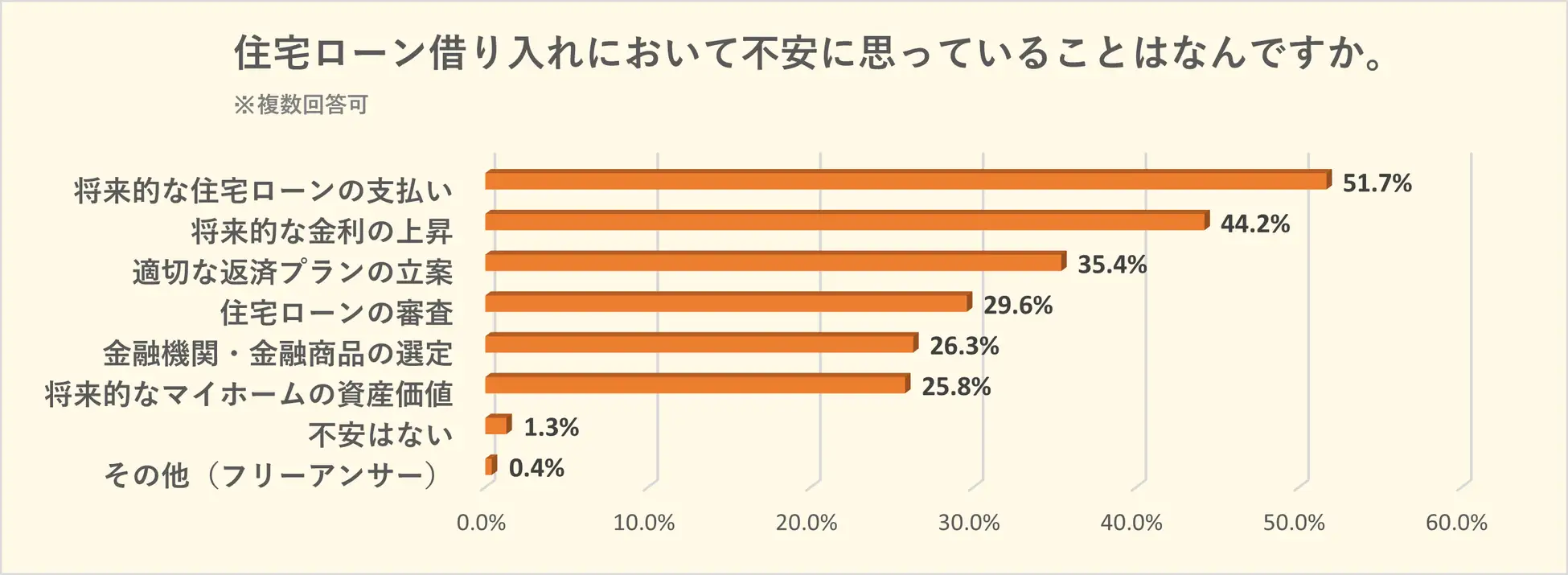 唯一過半数だったのは「将来的な住宅ローンの支払い」の51.7%でトップ。続いて「将来的な金利の上昇」44.2%が2位となりました。
