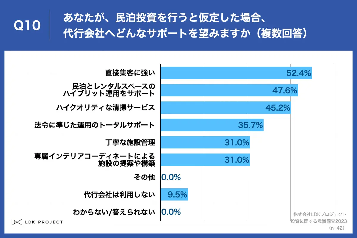 Q8で「とても興味が湧く」「少し興味が湧く」と回答した方に、「Q10.あなたが、民泊投資を行うと仮定した場合、代行会社へどんなサポートを望みますか(複数回答)」(n=42)と質問したところ、「直接集客に強い」が52.4%、「民泊とレンタルスペースのハイブリット運用をサポート」が47.6%、「ハイクオリティな清掃サービス」が45.2%という回答となりました。
