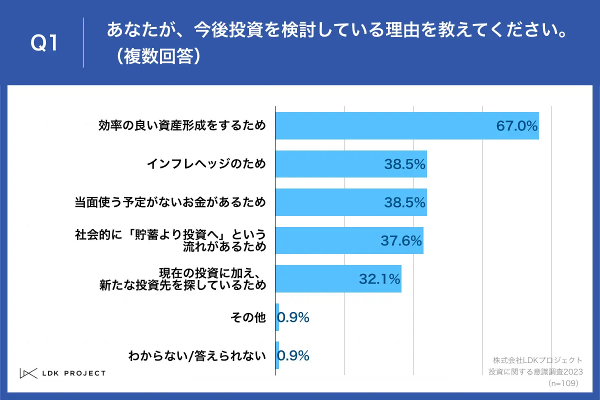 「Q1.あなたが、今後投資を検討している理由を教えてください。(複数回答)」(n=109)と質問したところ、「効率の良い資産形成をするため」が67.0%、「インフレヘッジのため」が38.5%、「当面使う予定がないお金があるため」が38.5%という回答となりました。