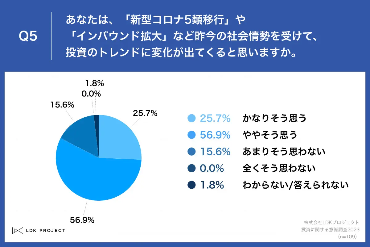 「Q5.あなたは、「新型コロナ5類移行」や「インバウンド拡大」など昨今の社会情勢を受けて、投資のトレンドに変化が出てくると思いますか。」(n=109)と質問したところ、「かなりそう思う」が25.7%、「ややそう思う」が56.9%という回答となりました。