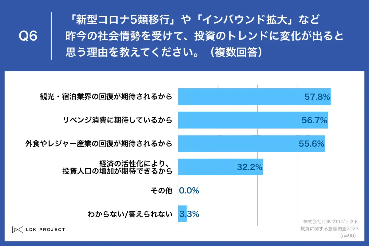 Q5で「かなりそう思う」「ややそう思う」と回答した方に、「Q6.「新型コロナ5類移行」や「インバウンド拡大」など昨今の社会情勢を受けて、投資のトレンドに変化が出ると思う理由を教えてください。(複数回答)」(n=90)と質問したところ、「観光・宿泊業界の回復が期待されるから」が57.8%、「リベンジ消費に期待しているから」が56.7%、「外食やレジャー産業の回復が期待されるから」が55.6%という回答となりました。
