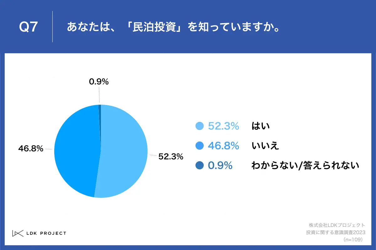 「Q7.あなたは、「民泊投資」を知っていますか。」(n=109)と質問したところ、「はい」が52.3%、「いいえ」が46.8%という回答となりました。