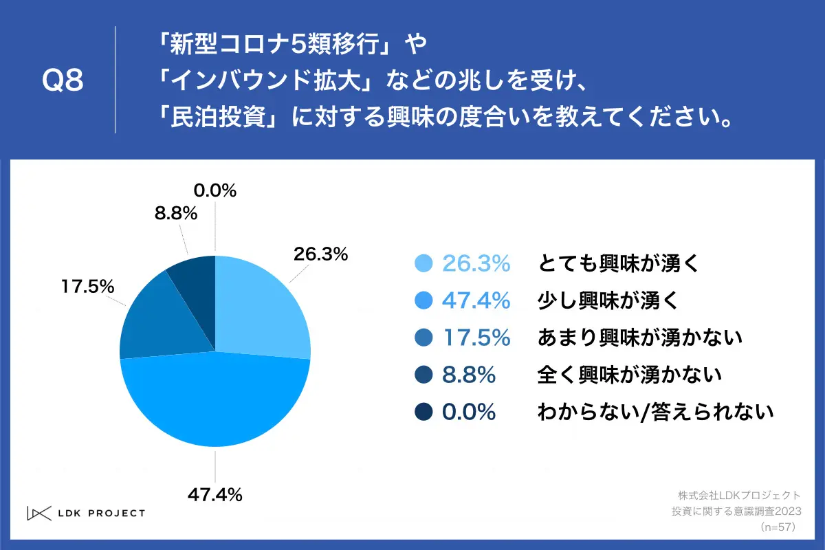 Q7で「はい」と回答した方に、「Q8.「新型コロナ5類移行」や「インバウンド拡大」などの兆しを受け、「民泊投資」に対する興味の度合いを教えてください。」(n=57)と質問したところ、「とても興味が湧く」が26.3%、「少し興味が湧く」が47.4%という回答となりました。