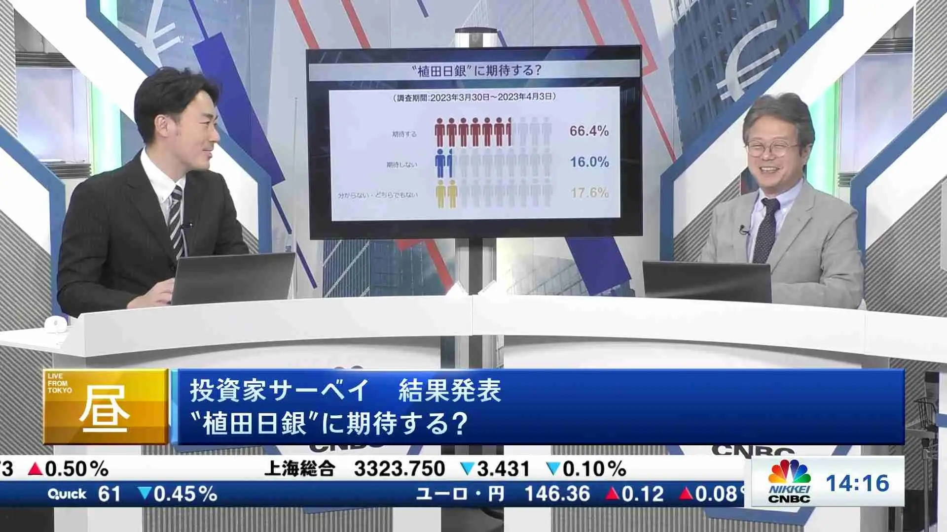 株式会社日経CNBC(本社:東京都千代田区、代表取締役社長:竹之内源市、以下「日経CNBC」)は4月13日、現役の投資家を対象に3月30日から4月3日までインターネットで実施した「植田日本銀行新総裁への期待」に関するアンケート結果を発表しました。結果は以下の通り「期待する」が全体の66%を占めました。