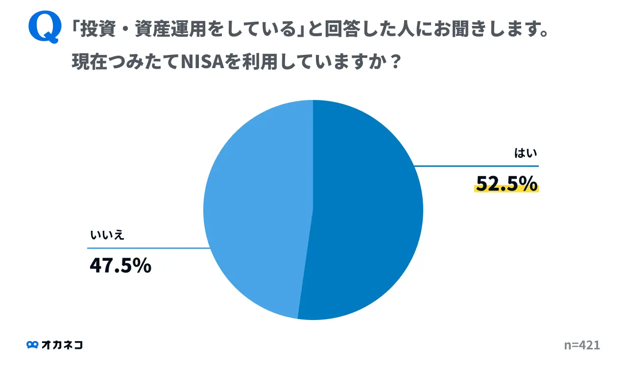 663名のうち「投資をしている」と回答した人は約64%。そのうち、約53%がつみたてNISAを利用していると回答しました。