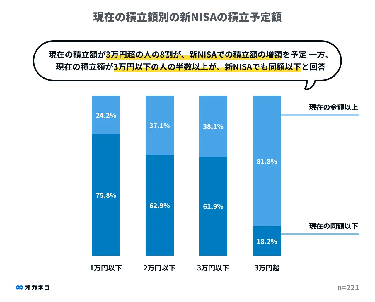 新NISAでの積立額を現在の積立額別に見ると、現在の積立額が3万円超の人の8割が、新NISAでの積立額の増額を見込んでいます。一方、現在「3万円以下」と回答した人の半数以上が新NISAでも同額と回答しており、積立額を増やす予定がありませんでした。