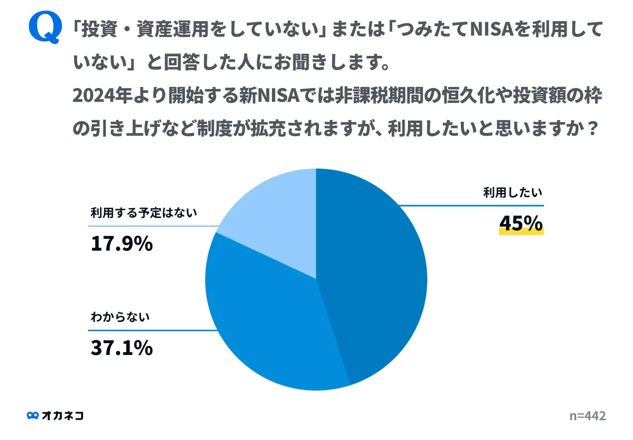 現在「投資・資産運用をしていない」または「つみたてNISAを利用していない」と回答した人に新NISAの利用意向を聞いたところ、45%が「利用したい」と回答しました。一方で、55%の人は「わからない」「利用する予定はない」と回答。