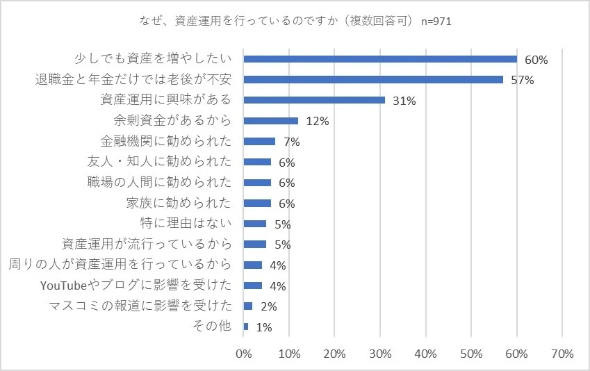 次に、「資産運用を行っている」と回答した971人に「なぜ、資産運用を行っているのですか」(複数回答可)と尋ねました。その結果、「少しでも資産を増やしたい」との回答が60パーセントで最多となりました。2位は「退職金と年金だけでは老後が不安」との回答が57パーセントとトップとほぼ同じ割合で入り、さらに「資産運用に興味がある」(31パーセント)との回答が続きました。