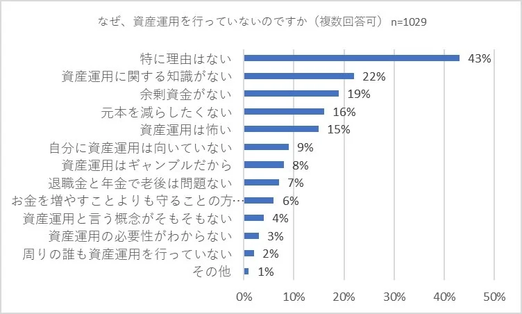 今度は前設問とは反対に「資産運用を行っていない」と回答した1029人に「なぜ、資産運用を行っていないのですか」(複数回答可)と質問したところ、「特に理由はない」との回答が43パーセントでトップになりました。2位以下は「資産運用に関する知識がない」(22パーセント)、「余剰資金がない」(19パーセント)、「元本を減らしたくない」(16パーセント)、「資産運用は怖い」(15パーセント)との回答が続きました。