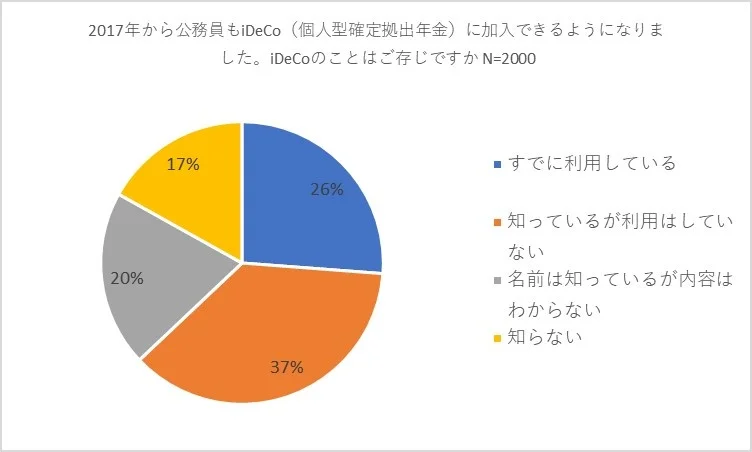 2017年から公務員もiDeCo(個人型確定拠出年金)に加入できるようになりました。そこで全員にiDeCoのことを認知しているかを質問しました。その結果、「知っているが利用はしていない」が37パーセントで最多となりました。次に「すでに利用している」が26パーセントで続き、約1/4の方がすでにiDeCoを利用していることが分かりました。以下は「名前は知っているが内容はわからない」(20パーセント)、「知らない」(17パーセント)との結果となりました。