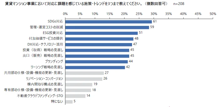 賃貸マンション事業のトレンドは、リモートワーク定着による「専有部共用部の仕様・設備・機能の更新・見直し」や、社会や投資家などのステークホルダーから企業への強い要請である「 SDGs/ESG 投資対応」への注力が見受けられ、課題としては、「SDGs ・ ESG 投資対応」、「管理・運営コストの削減」、「付加価値サービス・ DX 対応・ブランディング」による差別化、「投資 出口 リーシング戦略の見直し」など多岐に渡った結果となりました。