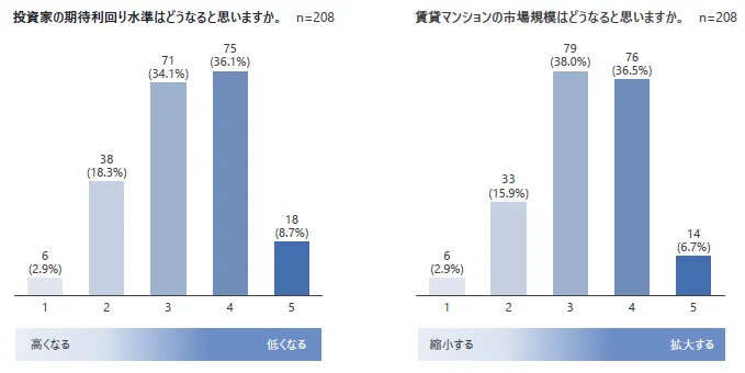 調査結果は、2023年の賃貸マンション市場は依然として堅調な投資家の投資意欲を背景に拡大を続けるとの見方が多く、半年後においても過半数は同様のマーケット見通しを示す結果となりました。しかし一方ではプレイヤーの市況感から、資源価格の高騰や金融引き締めの可能性などを背景とした、縮小に向うという見方も拡大しています。