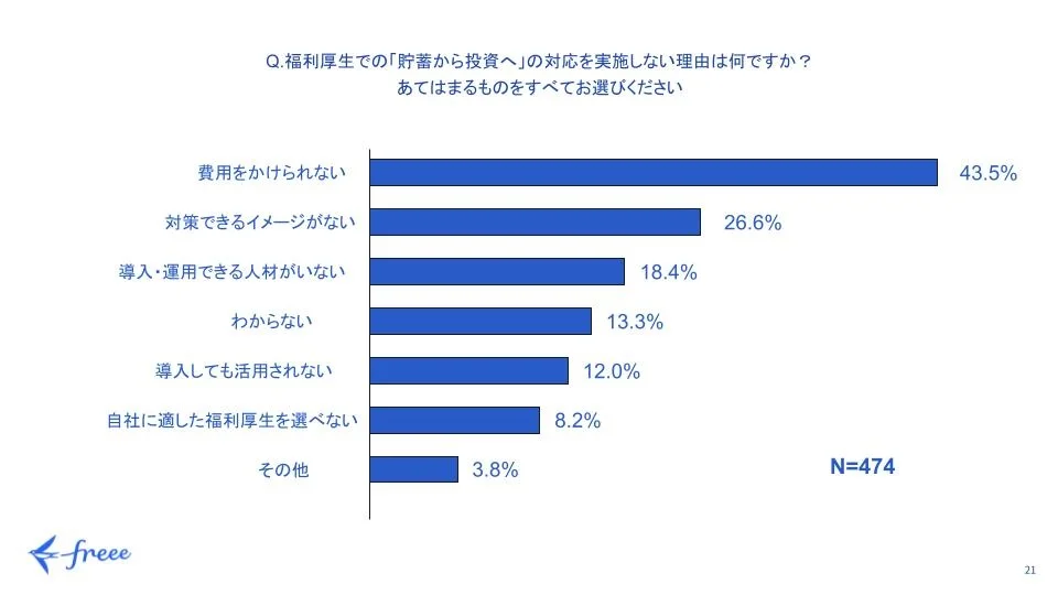 1つ目の設問で「検討の予定がない」と回答した方へ、福利厚生による対応を実施しない理由を問うと、「費用をかけられない」が43.5%、「対策できるイメージがない」が26.6%、「導入・運用できる人材がいない」が18.4%と費用や人材不足による理由が上位を占めています。