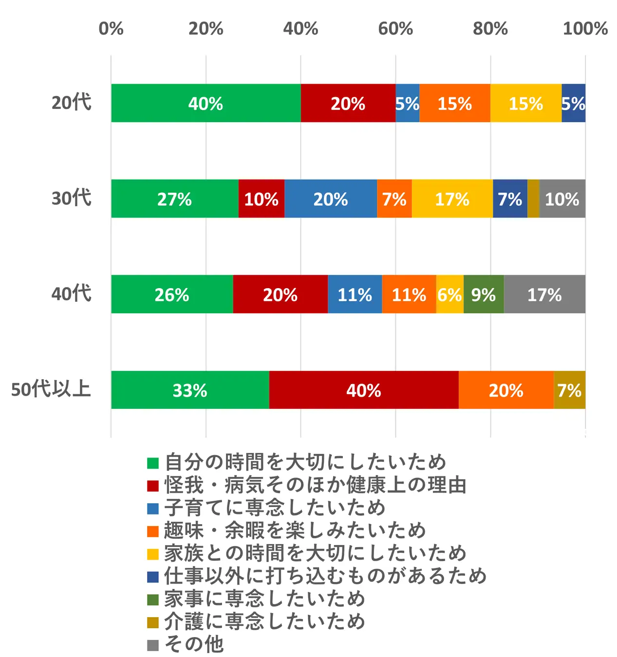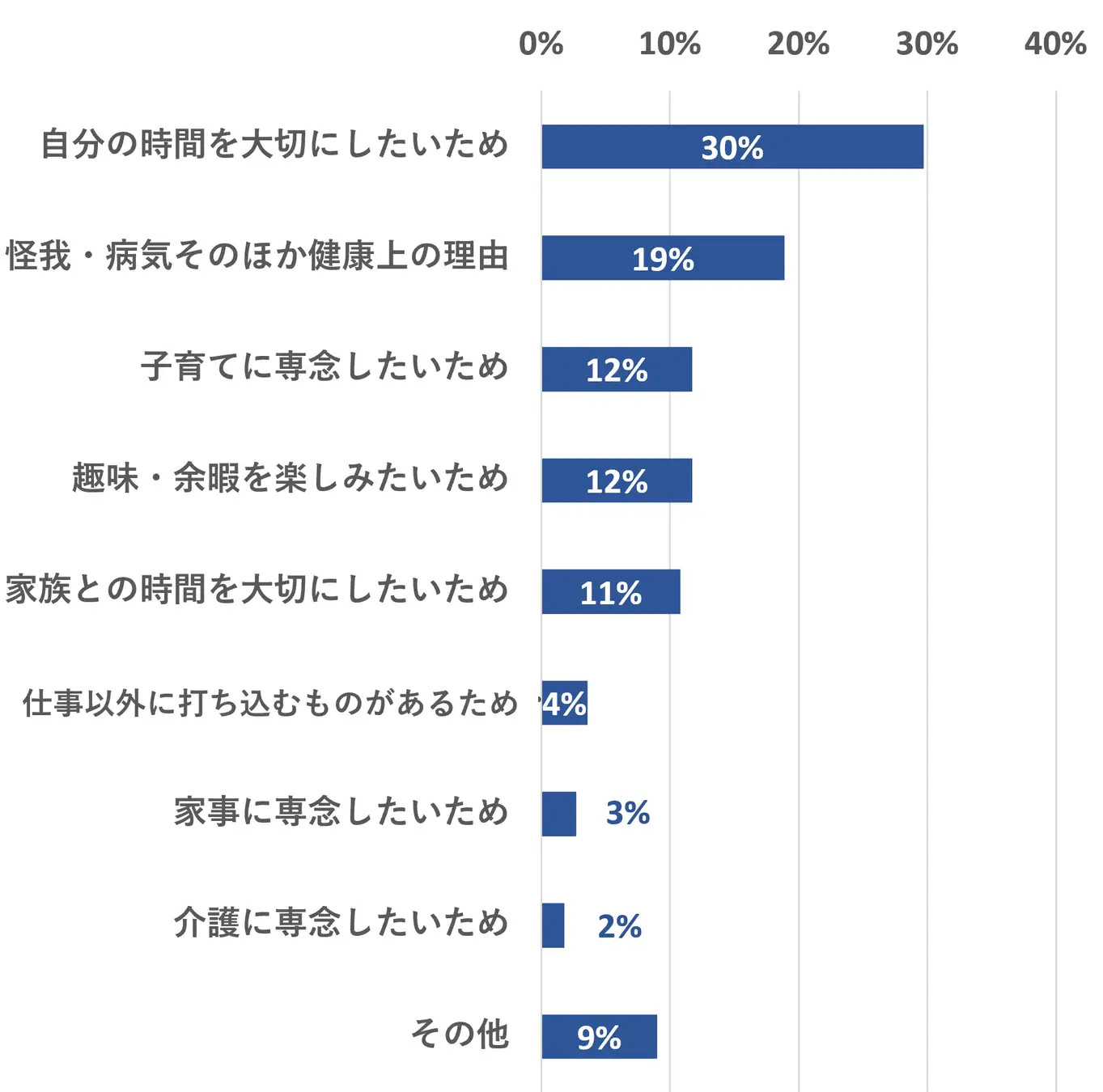 一方で、「趣味・余暇を楽しみたいため」との回答は12%に留まっていることから、「自分の時間を大切にする」ことの意味合いに幅があることが窺えます。