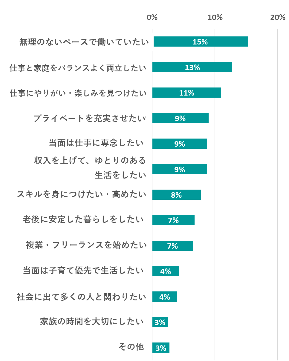 これからの働き方や生き方で望んでいることで、最も高い割合を占めていた回答は「無理のないペースで働いていたい」で、全体の15%でした。