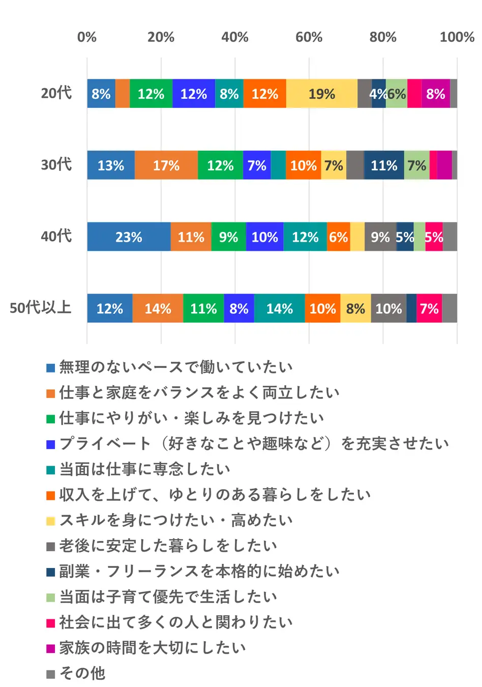 年齢を重ねるごとに、働き方と健康・暮らしとのバランスに対する関心が高まっていく傾向があります。