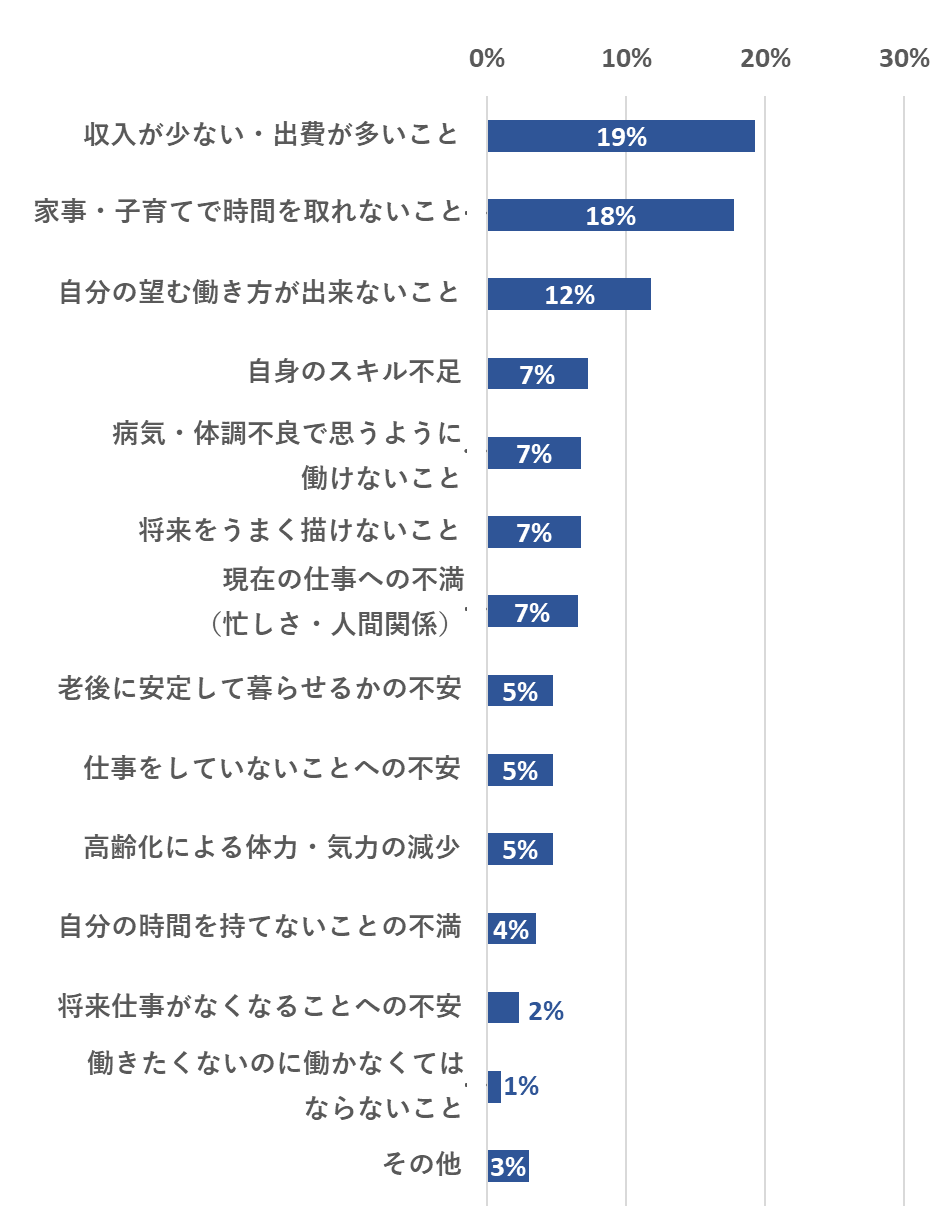 最も多かった回答は「収入が少ない・出費が多いことへの不安・不満」で、全体の19%を占めていました。