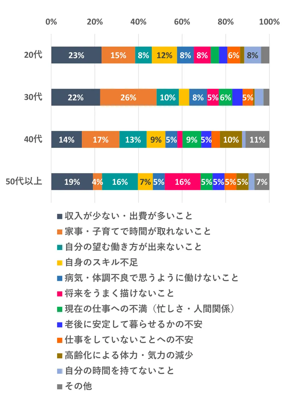 「働き続けたい理由」の質問では全年代で3割以上の方々「現在の生活を維持するため」と答えていたことを踏まえると、経済的な問題に対する不安・不満を抱えている方が数多くいることが分かります。