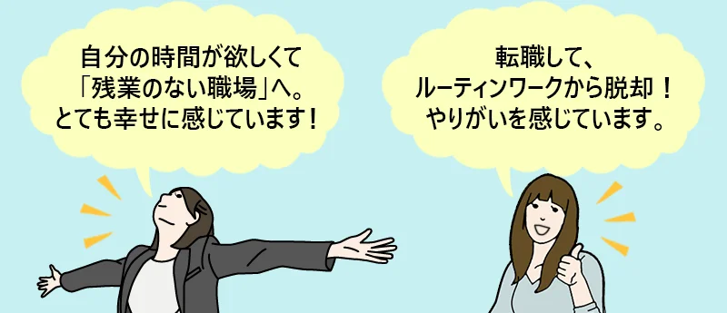 | 「銀行員からWebディレクターに転職しました。 銀行員のときは毎日がルーティンワークでしたが、Webディレクターになってからは、「同じ日は二度とやってこない」感じです。その分忙しくはありますが、やりがいを感じられますし、今の仕事の方が自分に合っていると感じます。」 (30代 女性 クリエイティブ職 大阪府 年収300万円〜400万円) |
