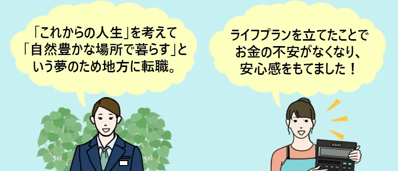 | 「生活していくのに一番心配なのはお金のことですよね。 ですが、ライフプランを立てたことで子供の教育資金や住宅ローン、老後などの心配がなくなり、安心感をもつことができました。 現在建てた計画でこのまま貯金していけば、この先の人生でお金に困ることはないと思っています。 一度しっかりとライフプランを立てると、その先は計画通りやっていけば良くて楽なので、プランを立てて良かったと思っています。」 (30代 女性 企画/管理 神奈川県 世帯年収500万円〜600万円) |