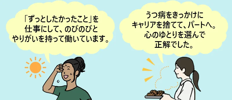 | 「2013年にうつ病になって、2年間の闘病生活ののちに職場復帰したのですが、いつ再発するかが常に怖かった。だから私は、理学療法士のキャリアを捨てて、パン屋のパートに就職しました。 パン屋を選んだ理由は、1日6時間の短時間勤務だったのと、なによりパンが好きだったから。毎日パンの香ばしい香りに包まれて幸せです。年収よりも心のゆとりを選ぶのが、私には正解でした。」 (ラッキーさん 40代 女性 販売/サービス職 大分県 世帯年収500万円〜600万円) |