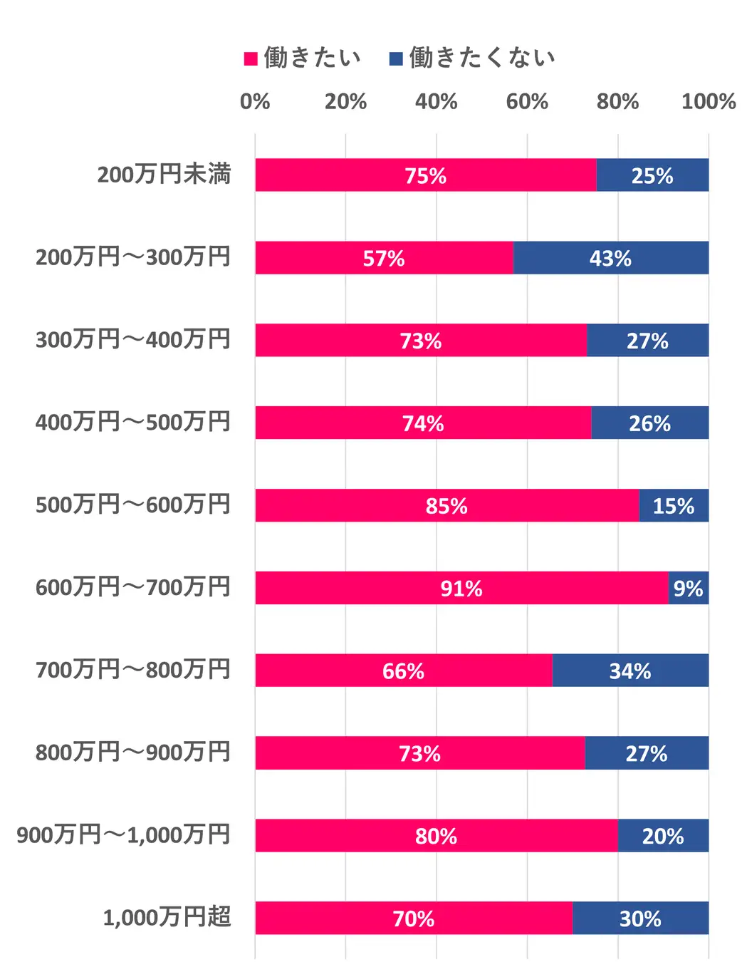 女性の世帯年収別「働きたい / 働きたくない」割合