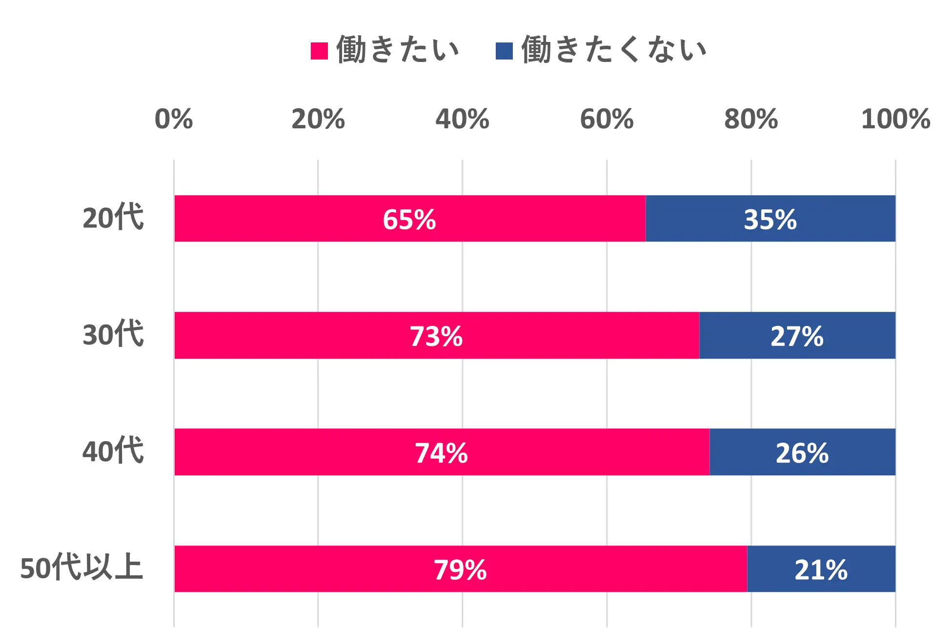 年代別の結果では、年齢が上がるほど「働きたい」という回答が増える傾向が見られました。