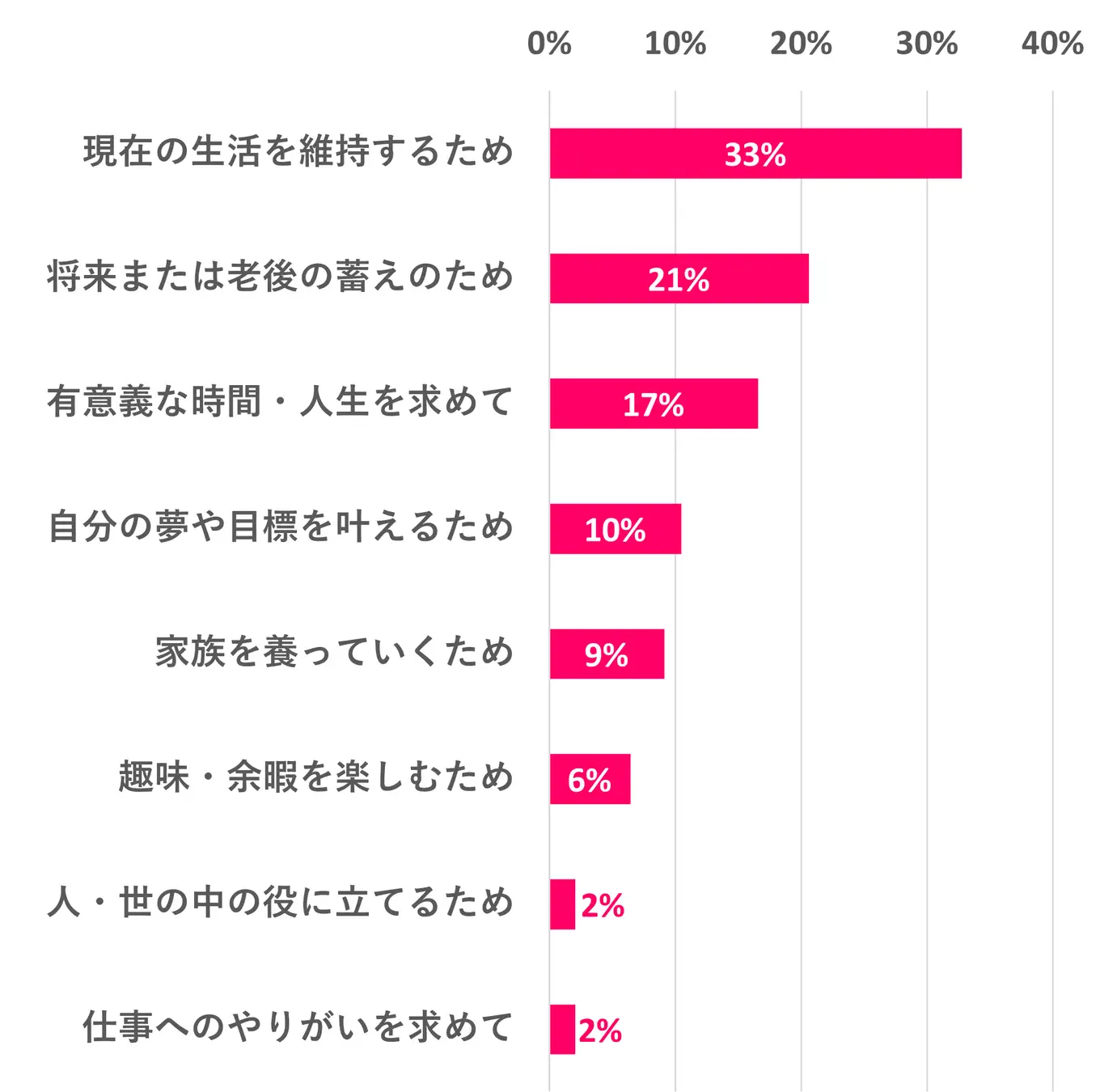最も多かった回答は「現在の生活を維持するため」で、働き続けたいと回答した方のうち33%を占めています。
