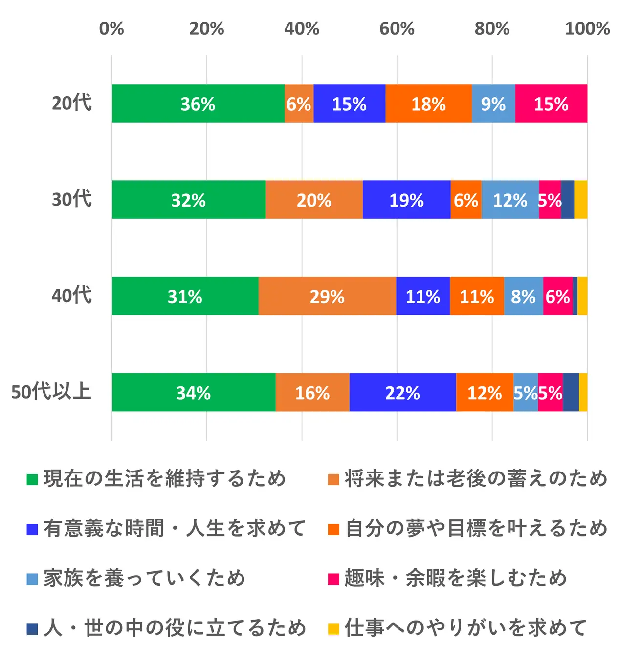 反対に「趣味・余暇を楽しむため」と回答した人の割合は、30代以上では5〜6%に留まっていました。