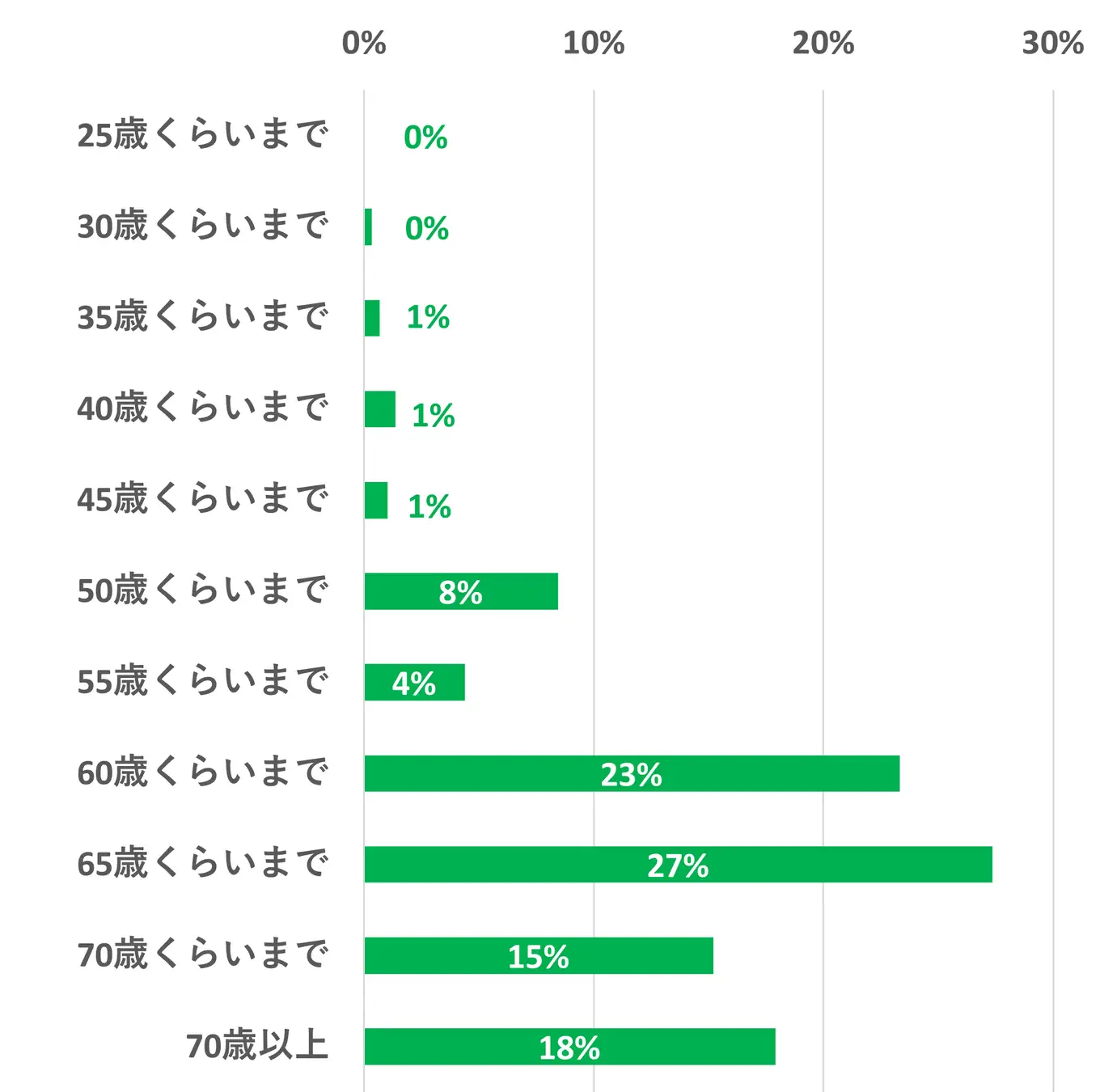 最も多かった回答は「65歳くらいまで」で、全体の27%を占めていました。公的年金の支給開始年齢にあたることから、年金の受給年齢を1つの区切りと考えている方が多いことが推測できます。