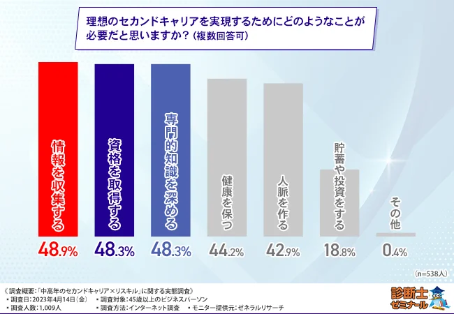 ここまでの調査で、理想のセカンドキャリアをかなえるためには、情報収集や知識の習得、資格取得が必要だと考える中高年が多いことがわかりました。