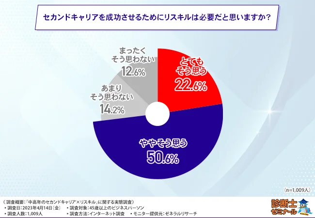 さらに、セカンドキャリアを成功させるためには情報収集やスキル習得が必要であり、学びなおし(リスキル)が重要だと考える方が7割以上に上りました。