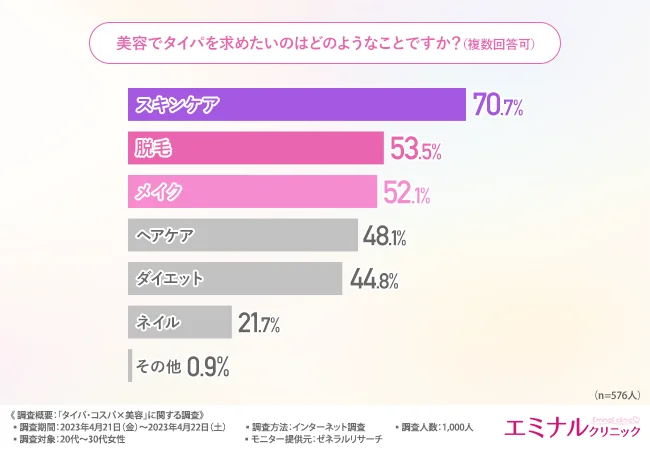 そこで今回、医療脱毛のエミナルクリニック(https://eminal-clinic.jp/lp01/?refmedia=11073)は、20代〜30代女性を対象に、「タイパ・コスパ×美容」に関する調査を実施しました。