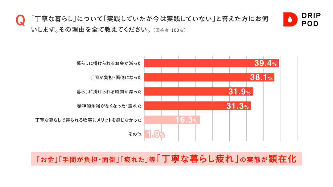 「お金」「手間が負担・面倒」「疲れた」等「丁寧な暮らし疲れ」の実態が顕在化。